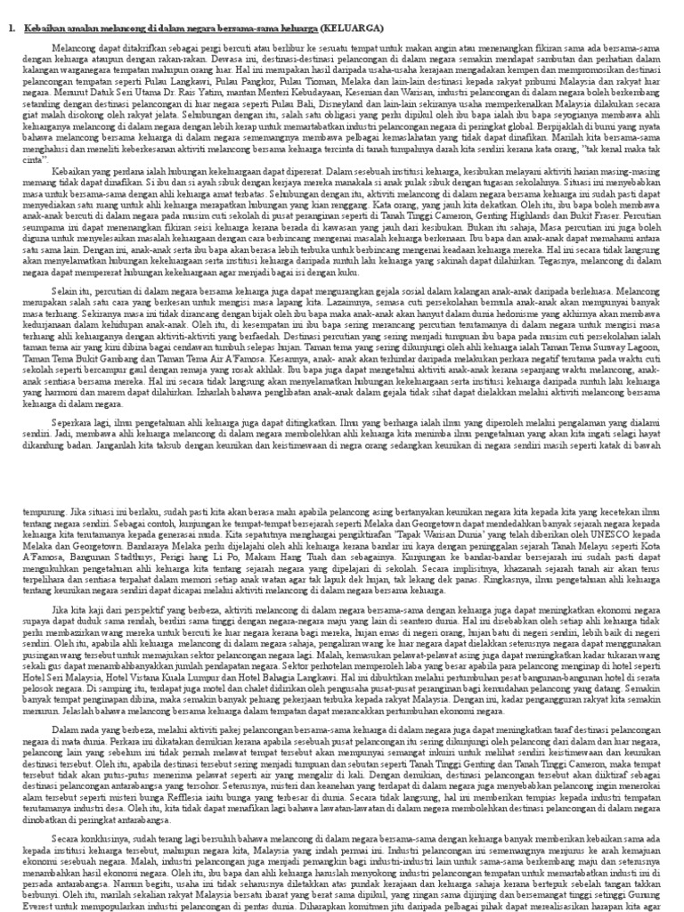 Contoh Karangan SPM Kebaikan amalan melancong di dalam negara bersama-sama keluarga KELUARGA Melancong dapat ditakrifkan sebagai pergi bercuti atau berlibur ke sesuatu tempat untuk makan angin atau menenangkan fikiran sama ada bersama-sama dengan keluarga ataupun dengan rakan-rakan. Ø Daripada keluarga lahirnya insan yang. Antara cara yang boleh dilakukan oleh ibu bapa dengan anak-anak untuk mengeratkan hubungan keluarga ialah keluarga boleh makan bersama-sama.